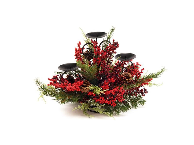 CANDELIERE X3 PINO SIMPLE C/BACCHE E PIGNE CM37X65 VERDE/ROSSO